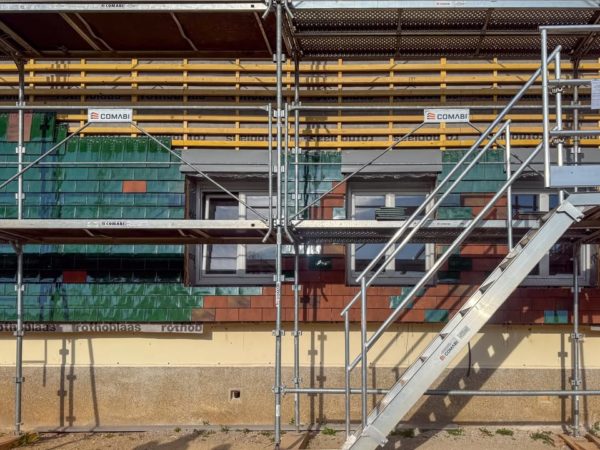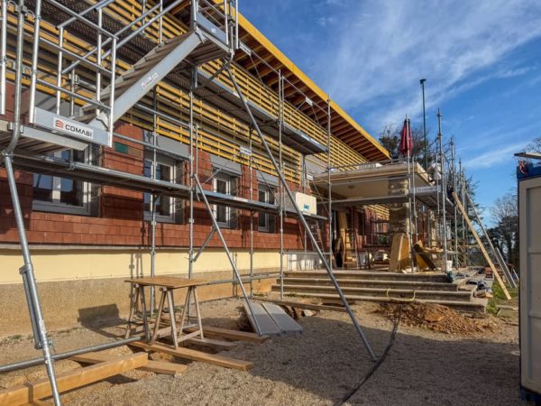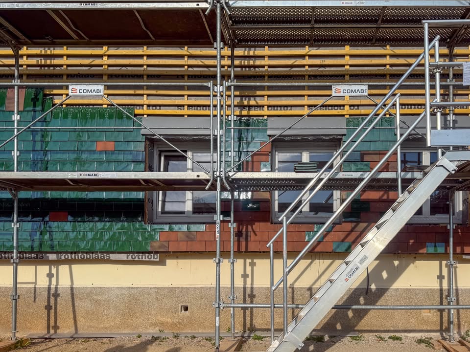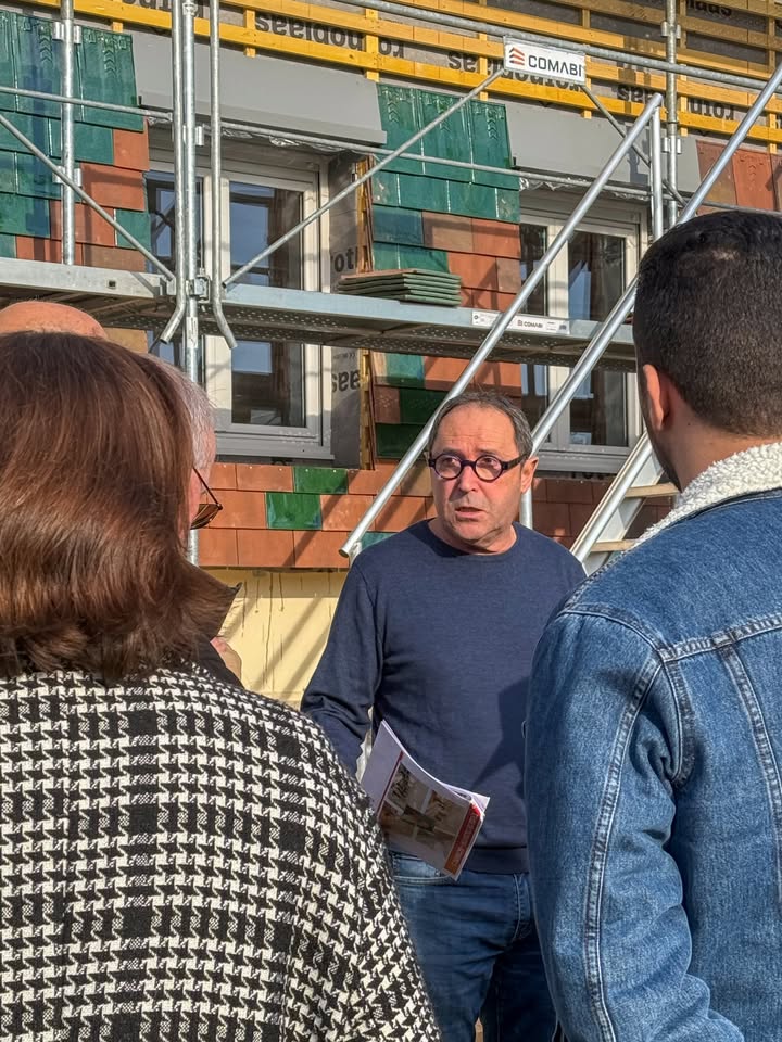 👷♂️ Le chantier avance à grands pas ! L’habillage des bâtiments est un travail minutieux 🛠️ Deux façades des 4 bâtiments principaux sont en train d’être traitées avec un bardage tuile.
