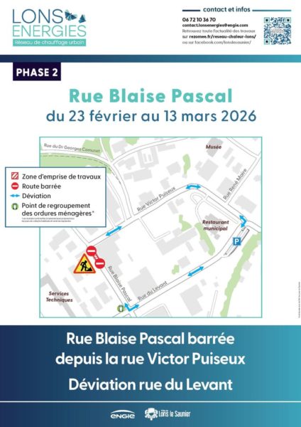 🚧 Des travaux d’extension du réseau de chaleur urbain sont programmés dans votre quartier à Lons-le-Saunier, du 4 février au 13 mars 2026, dans les rues Victor Puiseux, Blaise Pascal, du Levant et du Dr Georges Camuset.