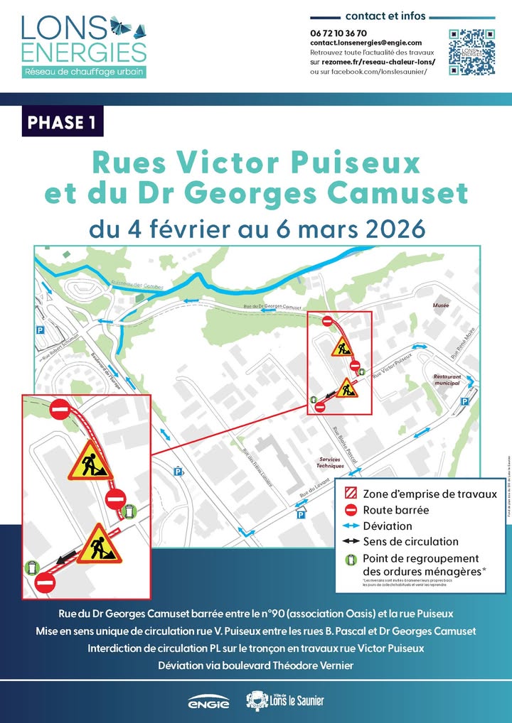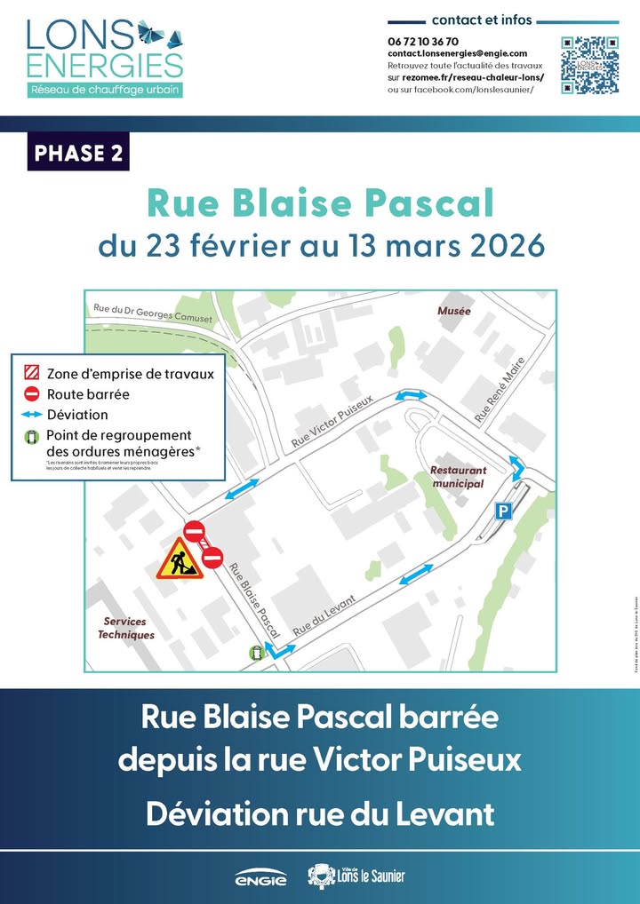 🚧 Des travaux d’extension du réseau de chaleur urbain sont programmés dans votre quartier à Lons-le-Saunier, du 4 février au 13 mars 2026, dans les rues Victor Puiseux, Blaise Pascal, du Levant et du Dr Georges Camuset.